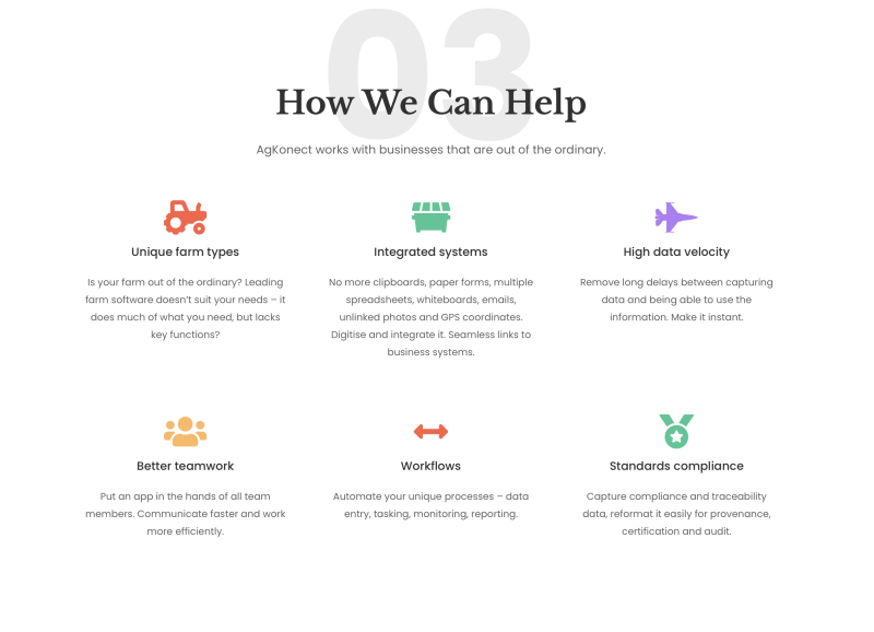 AgKonect creates purpose-built data systems that meet the specific needs of farm businesses. We focus on our products for turf and vineyard management, to deliver efficiencies and new opportunities from advanced use of farm data.