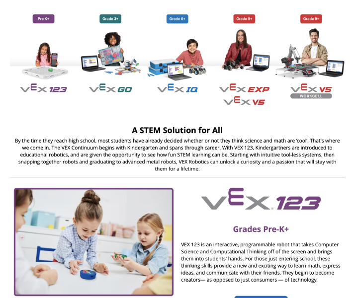 VEX Robotics is educational robotics for everyone. VEX solutions span all levels of both formal and informal education with accessible, scalable, and affordable products.